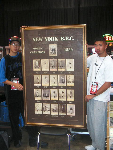19 1/2 inches tall (had a sold sign). Lyman Hardeman, Editor of Old Cardboard magazine of Austin Texas, had a great, small, c1880’s advertising display for Boston Garters. Nicely finished, looked like Mahogany, 12 ˝” tall by 8 ľ” deep by 11 5/8” wide. Not for sale. Darrell O’Mary of Sports Paradise, from Marietta, GA., had a very large framed collage of correspondence between Ty Cobb and George Weiss see below. The collage contained a two-page letter from Cobb apologizing for not being able to come to Cooperstown as he had planned, on account of his wife having Hepatitis. The collage also had a return telegram from Weiss, and a photograph of Cobb. Now that’s the way to display a letter! Framed: 41 Ľ” wide by 26 ˝” tall, $5,000.00