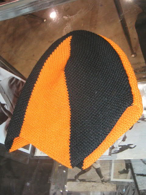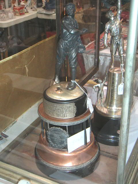 P110 LYONS 1880s pencil box.JPG (79184 bytes) c1890’s baseball pencil box. $350.00 . Fred Edgemon of Signal Mtn. Tennessee had an unusual 1884 striped knit cap with the Princeton colors of orange and black . Fred was able to pinpoint the year by tracing the patent number. Dick Hinds of Cincinnati had two especially nice trophies, one a 1932 figural golf trophy 16 1/2 inches tall, the other a 1924 figural baseball trophy