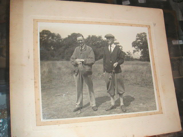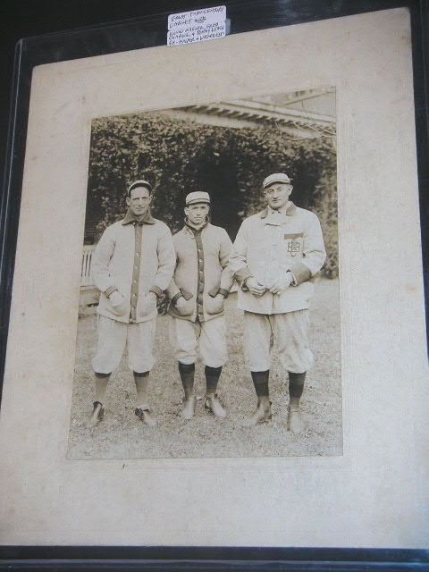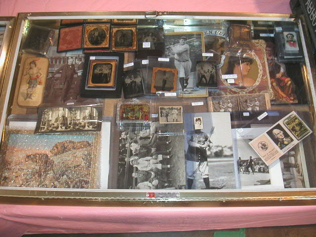 The Prolific Glenn Mechanick of C&M Collectibles from New Jersey came with his usual array of excellent material. First up, a c1904 cabinet photo of Honus Wagner, Fred Clark, and Tommy Leach, 8” wide by 10” tall, $3,500.00 . Next Glen had seven c1880’s die cut baseball players, of various teams and positions, which were McLoughlin board game pieces, mounted on wooden backings and bases. Very rarely do you see these for sale. 5”-5 ˝” tall, $150.00 each see below. Glenn also had a very nice generic c1930’s golf photo. A classic with golfers wearing plus four pants etc., 8 Ľ” wide by 6 ˝” tall, $100.00 . I came across Glenn’s booth right at the end of my last of two days there. I had to hurry thru his things, so I took shots of all his display cases, case 1, case 2, case 3, case 4, case 5, which provided a pretty good vantage of his stock for being short on time.
