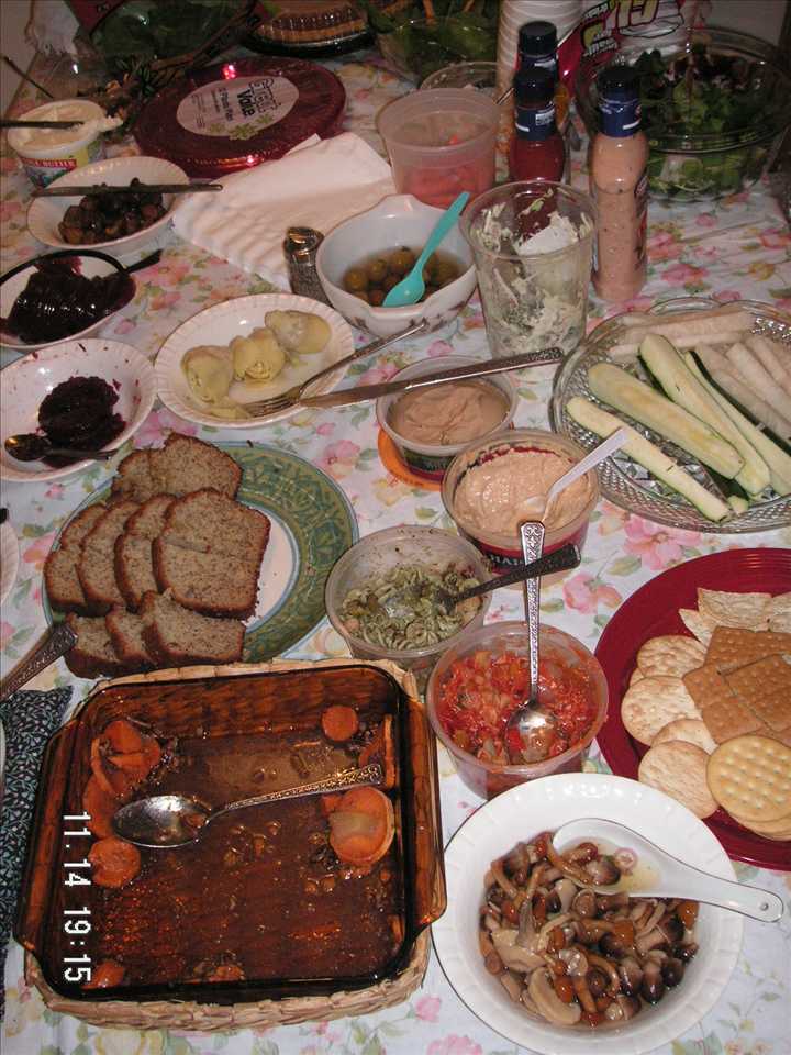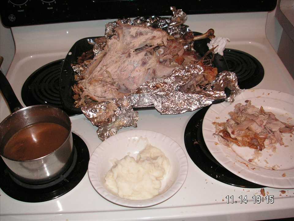 turkey with trimmings of yams, and mashed potatoes. Plus others brought