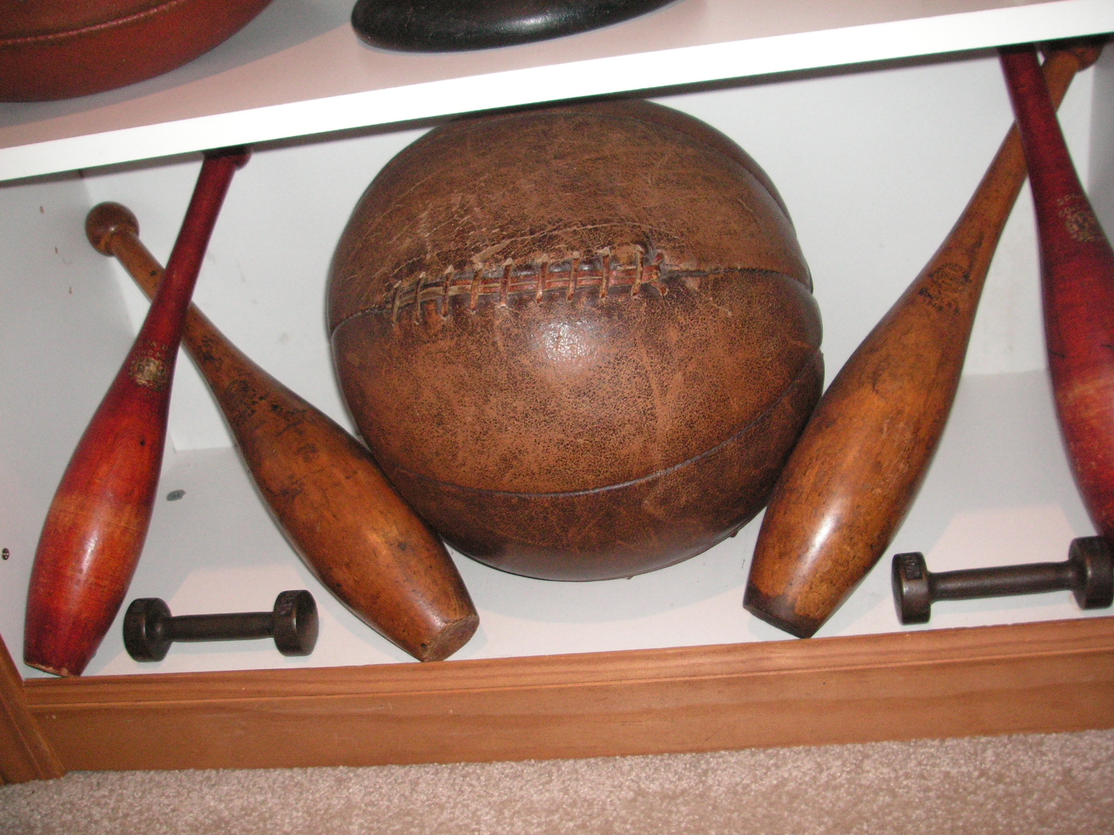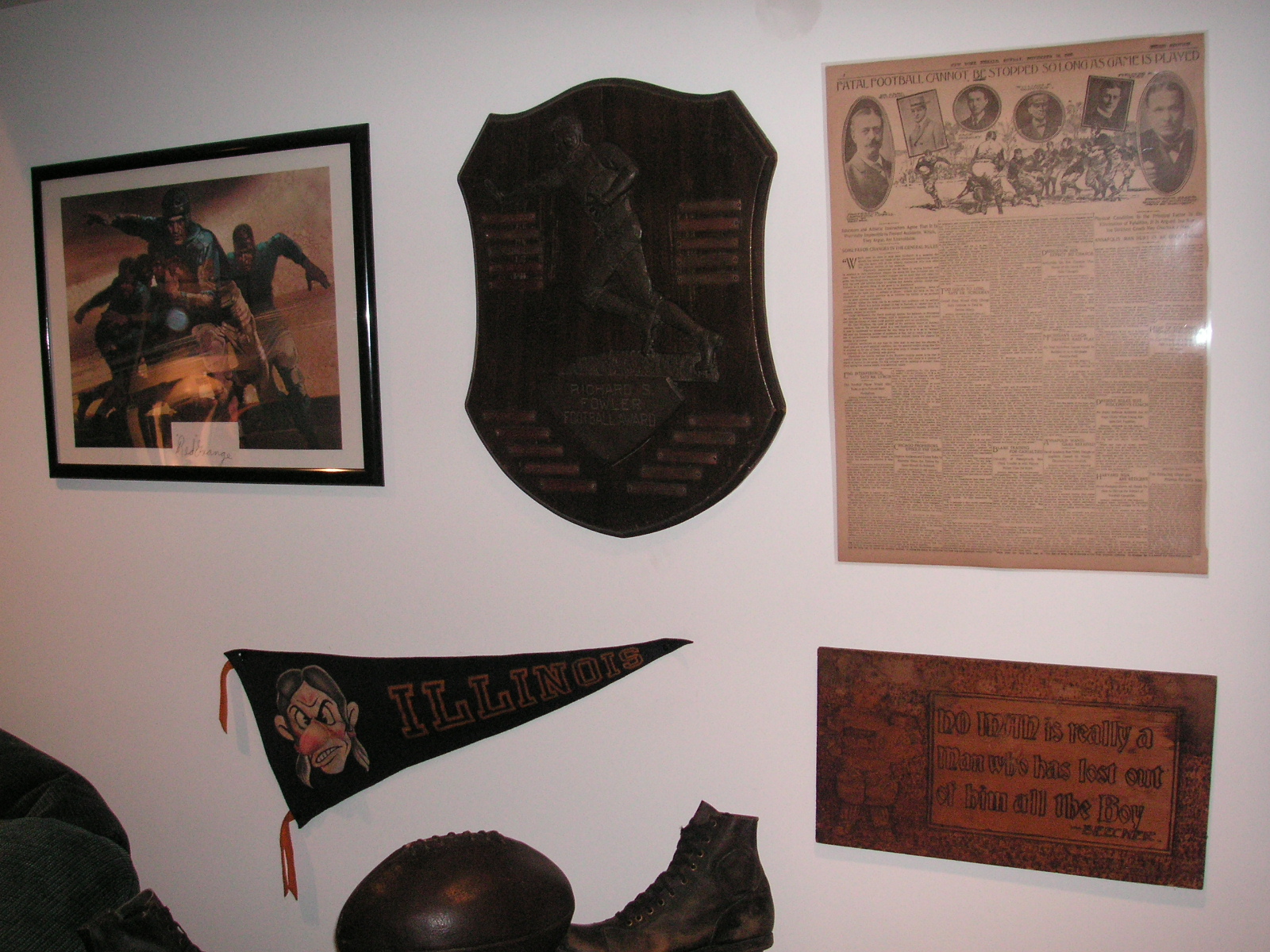 "I've been collecting vintage football items for about 13 years. I started by just wanting 1 leather football helmet. Loving the game of football so much as a player and coach, I was intrigued with the roots of the game. I searched every antique shop I came to with no luck for over a year. My parents found 2 old 1940's leather helmets at an antique shop in Wisconsin and bought them for me for Christmas 13 years ago and that was the start of my obsession. I enjoy having a nice assortment of items that span the decades the game has been played. I often wish I could go back and talk to the men who used to