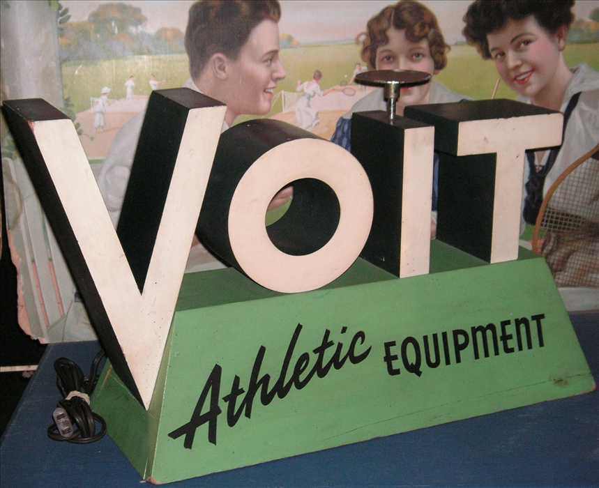Next I spotted a very unusual 3-dimensional, Voit Athletic Equipment advertising sign/display. I've only seen one other example of this sign right there at the KarbergCaseVoit.jpg (85075 bytes) same show in August 2005. Mike Karberg of Blue Mirror Antiques out of Chicago had it and was asking $600.00 I think. When I first got it I wasn't sure about it. Now that I have it home though I'm wild about it! The way it's designed is very cool. The letters are...I don't know what you'd call it....deep I guess, very deep...made of all wood. AND it gets better....it's motorized.