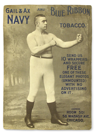 It’s been my opinion a long time that overall, Athletic Display Antiques are very undervalued, particularly compared to prices paid for contemporary sports memorabilia. This circa 1889 tobacco advertising sign featuring the great American boxer John L. Sullivan serves as the perfect illustration of that. The sports antiques world is full of great and important piece, but this poster commands special attention. When I saw it only brought $2,357.95 plus buyer’s premium, in Leland’s December 2002 auction, I had to shake my head. Whoever got it, scored an easy knockout.