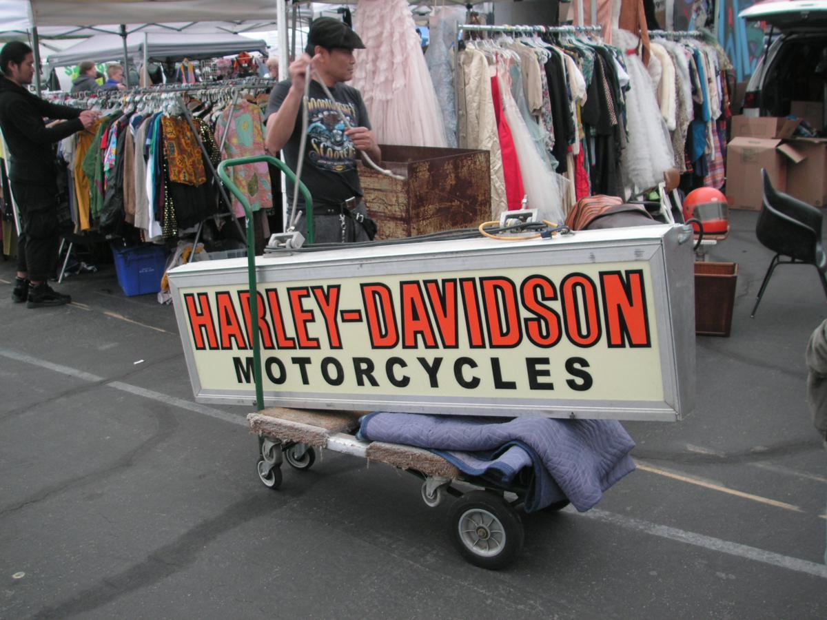 signs…So forgot about it and moved on….a few hours later I was going thru the back part across the bridge…where all the vintage clothing dealers are…so I’m walking along and I see an Asian guy pushing the Harley sign on a cart…so I go over and start talking to him….very nice guy named Danny….very interesting…I didn’t tell him I already saw it on the other side….I asked how much he would sell it for…said wasn’t for sale….and that he would be shipping it to his store in Thailand…Said he has an international client base….sells a lot of stuff to Europeans…