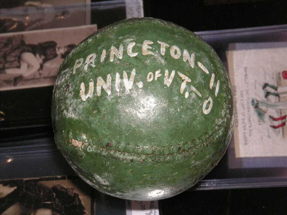 up was a green painted trophy baseball from a game between University