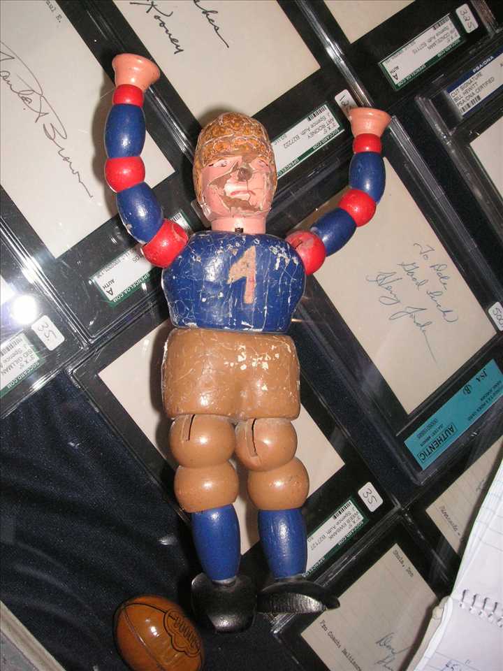 FBToyShonut.JPG (75857 bytes)Next was a  c1930 wooden football player toy, featuring moveable limbs. I believe it may have been made by the Schoenhut Company, poor condition, 8" tall, $100.00
