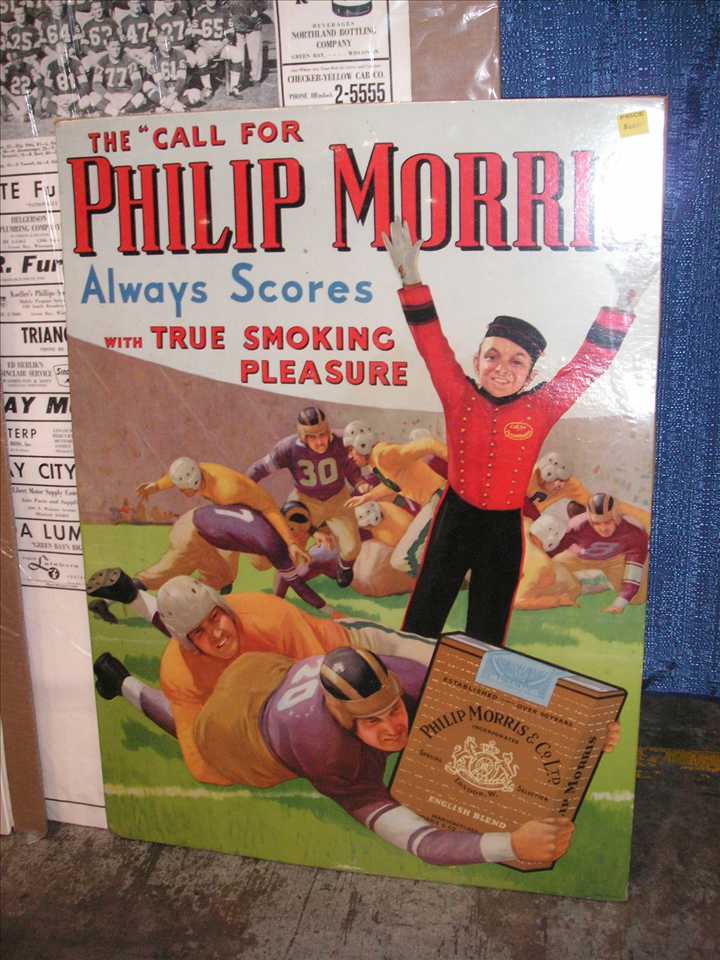 JohhnyPhilpMorris.JPG (83747 bytes)Next up was a c1940 advertising poster for Phillip Morris Cigarettes featuring an illustration of a football game with a player putting a pack of Phillip Morris' over the end zone line along with their famous "Johnny" as referee giving the touchdown signal, 29" tall x 21" wide, $600.00