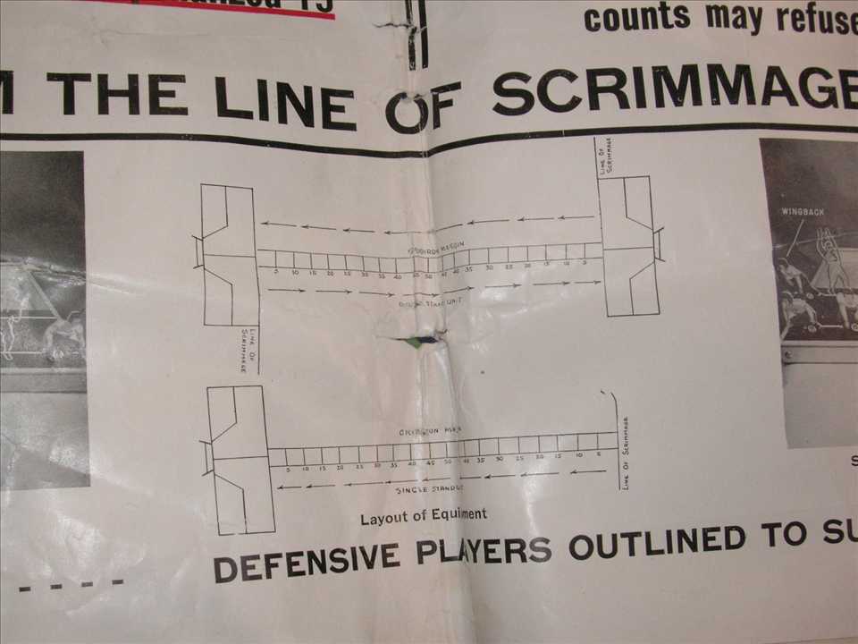 PiecesUpright.JPG (76583 bytes)Next up was a 1953 football table game called Scrimmage made by Big Times Game Company in El Paso Texas. Quite a rare game and big, only example I've seen, die cut players were 6" to 9" tall, box dimensions were 25" x 20 1/2", $600.00
