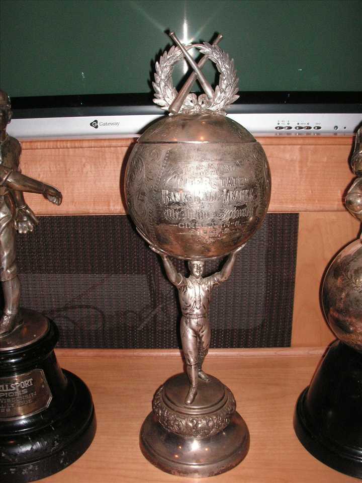 cool 11" tall 1908 trophy cup that has ring bats for handles,
